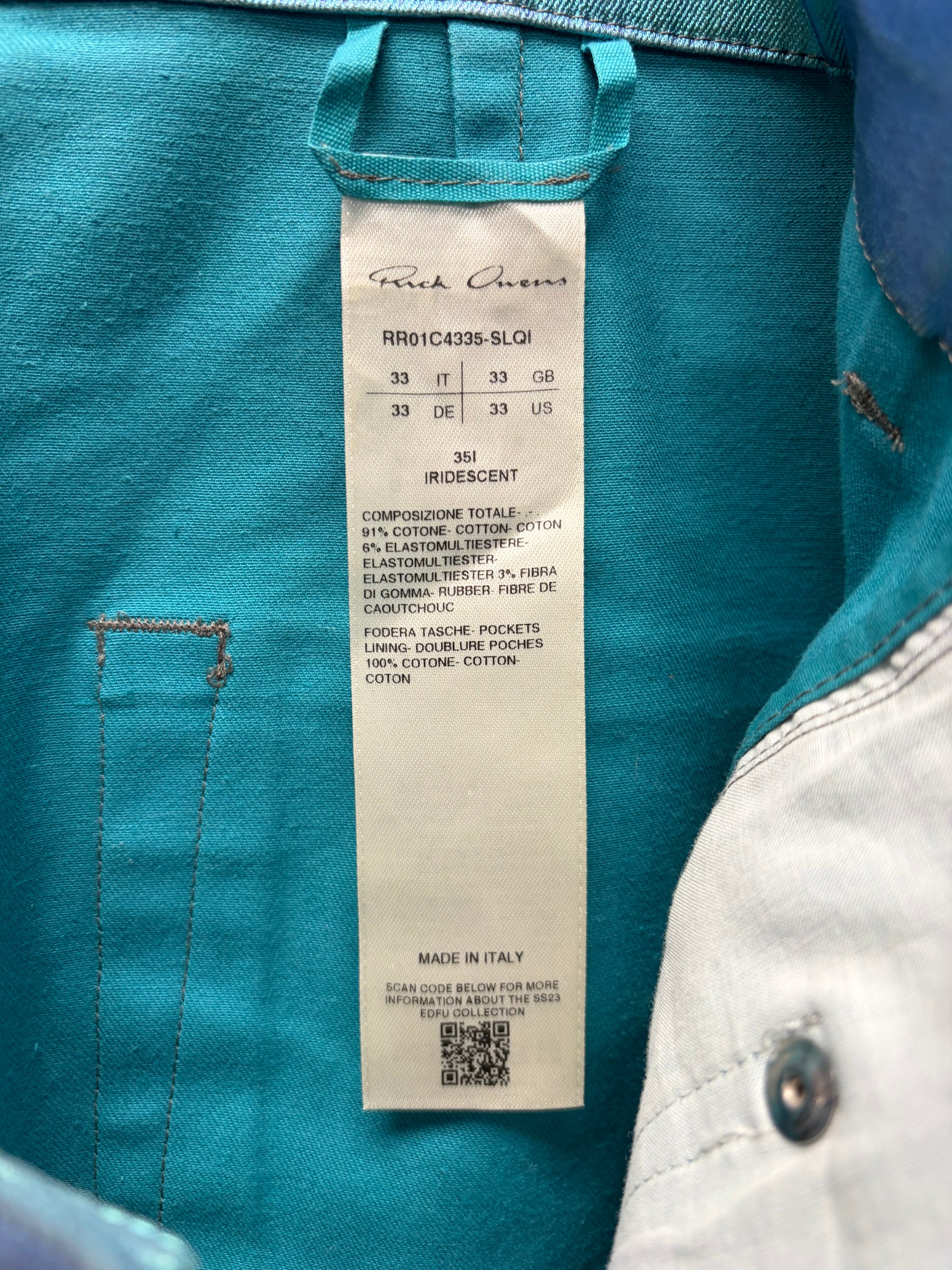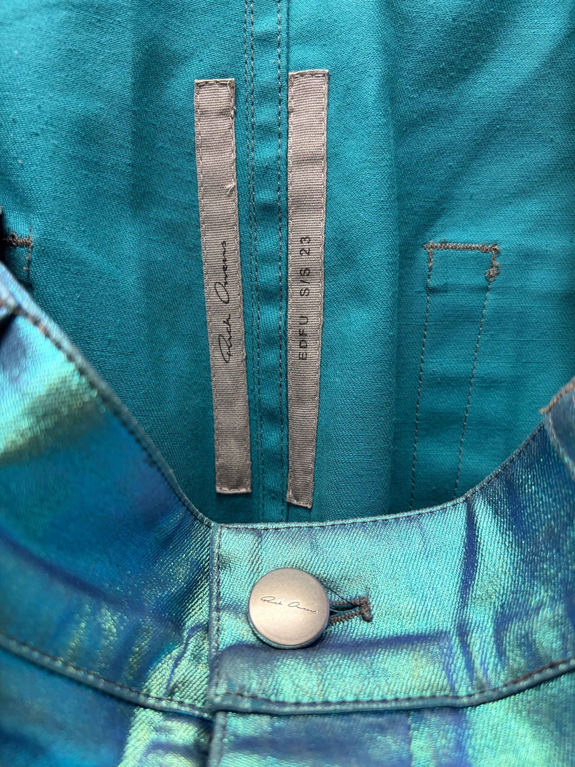 For sale is a SS2023 Rick Owens ‘Edfu’ Iridescent Blue ‘Bolans’ Flared Leg Pants